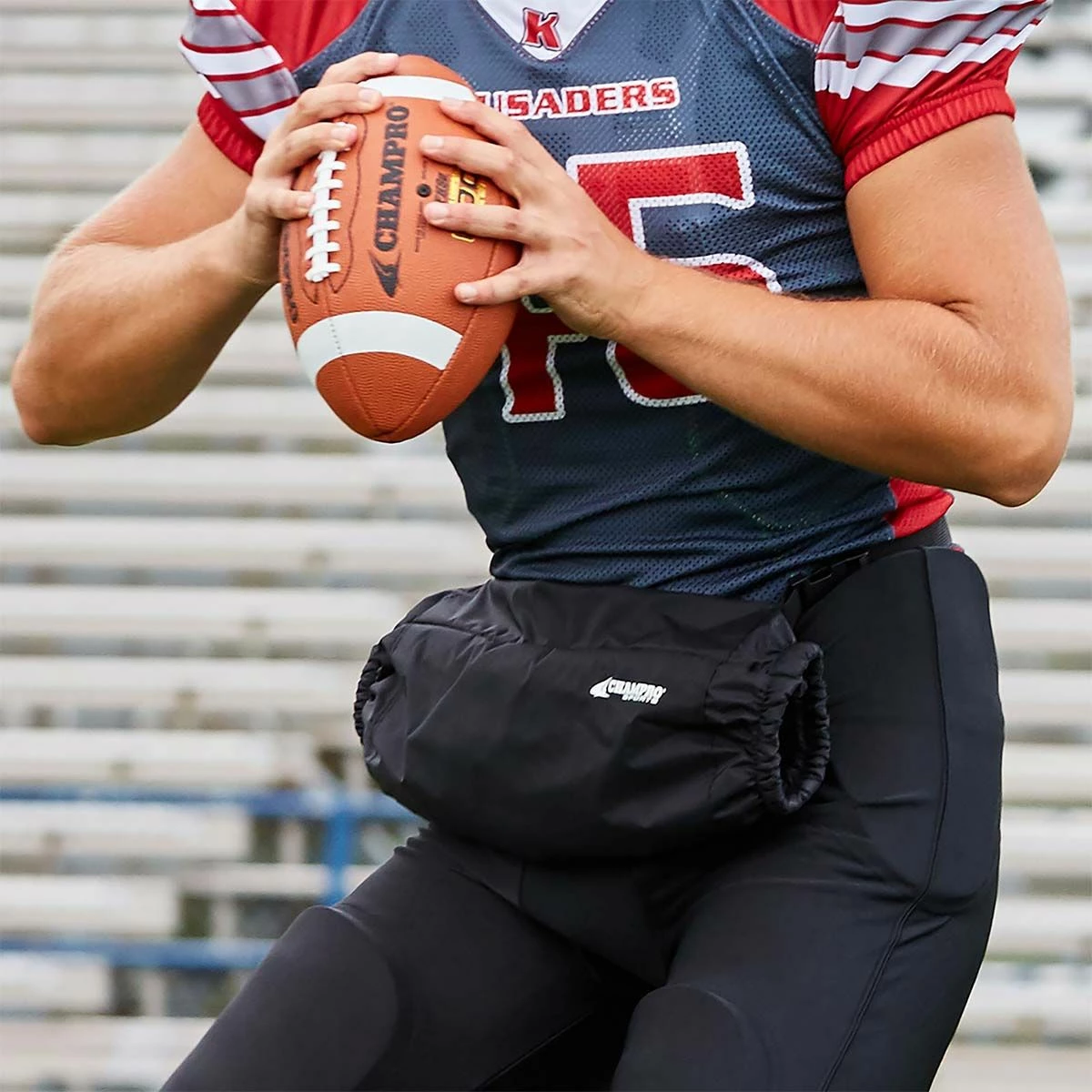 Quarterbacks and receivers will love the Champro football hand warmer with its easy to use adjustable waist strap and soft fleece lined pouch that keeps hands warm on cold weather game days. Heat packets can also be inserted for additional warmth. This football waist hand warmer is offered in black and in pink.