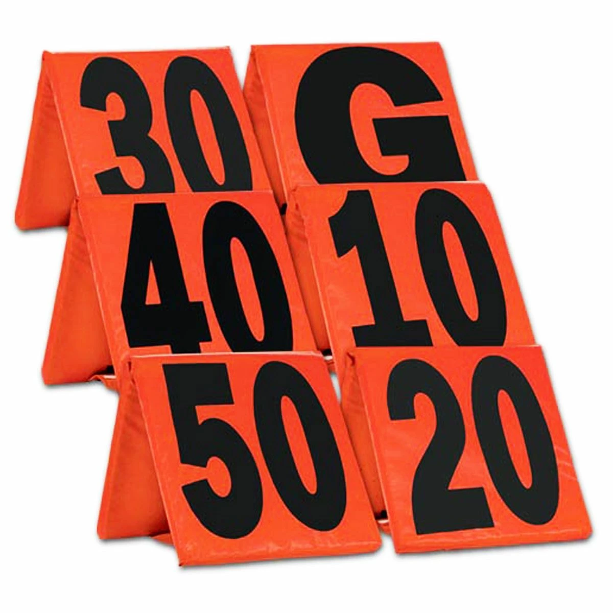 The Champro foldable, weighted football yard marker set includes all the yardage markers you need for your football field. This 11 piece set includes 2 markers each from the goaline “G” through the “40” yardline, plus one “50” yard line marker. These 15″ x 15″ free-standing makers feature a PVC covered foam construction that is built to last. The black colored yard line numbers are marked on two sides against a orange background for high visibility on the sideline.