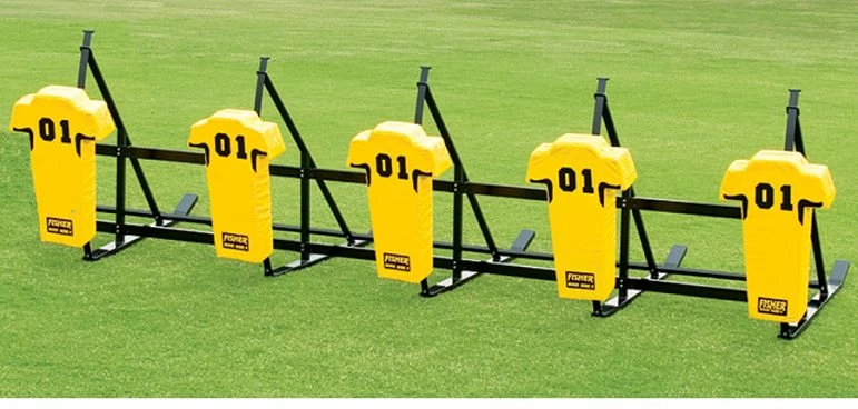 This Fisher CL JV 5 man sled is ideal for middle school through high school programs because of its TITE-LOCK modularΒ chassis that provides the rigidity needed in a multi-unit sled. Β Player safety is improved due to the wraparound design of the Man Pads.The main frame is tough, durable and guaranteed to last for 5 years. Β The all metal surfaces are powder coated to prevent rust and the leaf spring design virtually eliminates all spring cracking and breaking. Β The 30 degree angle on the skids assures you of a smooth transition over your field without chewing up your turf or grass. Β The high density, 100lb impact resistant foam is covered with durable 18oz vinyl covers that are then double and triple stitched to withstand harsh weather and years of hard use.