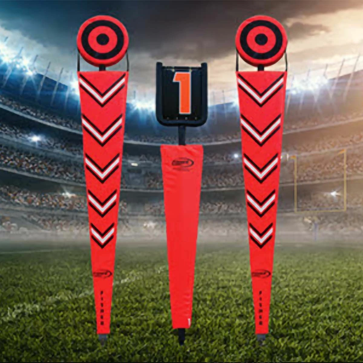 TheΒ Fisher 8′ chain set with flip down box is an economical set that includes the essentials of a chain gang set. The brightly colored indicators make it easy for your officials and fansΒ to see the down lines, every time!Β The 8′ Chevron chain set includes two brightly colored, padded targets with swivel hooks and a plated chain that eliminates kinks.Β The flip down box is padded for safety and features double-sided, colored numerals that bend, but will not break!