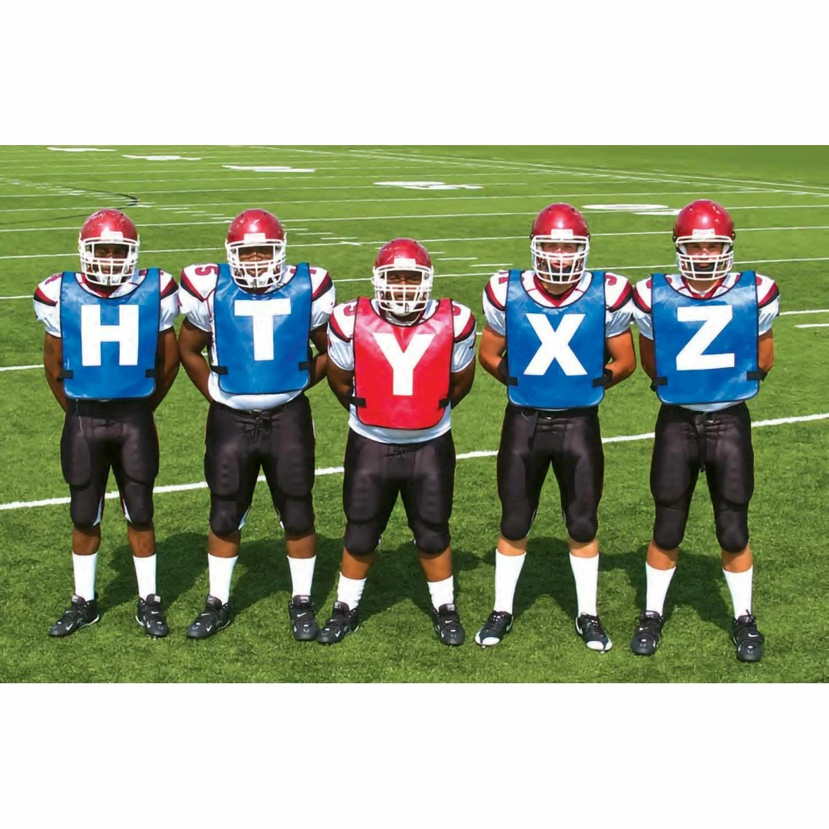 Fisher football scout vests help players and coaches identify key players and is a must-have for coaches in the film room! Β This set includes 4 blue vests with white letters (H, T, X and Z) and 1 red vest with a white letter “Y”.Β