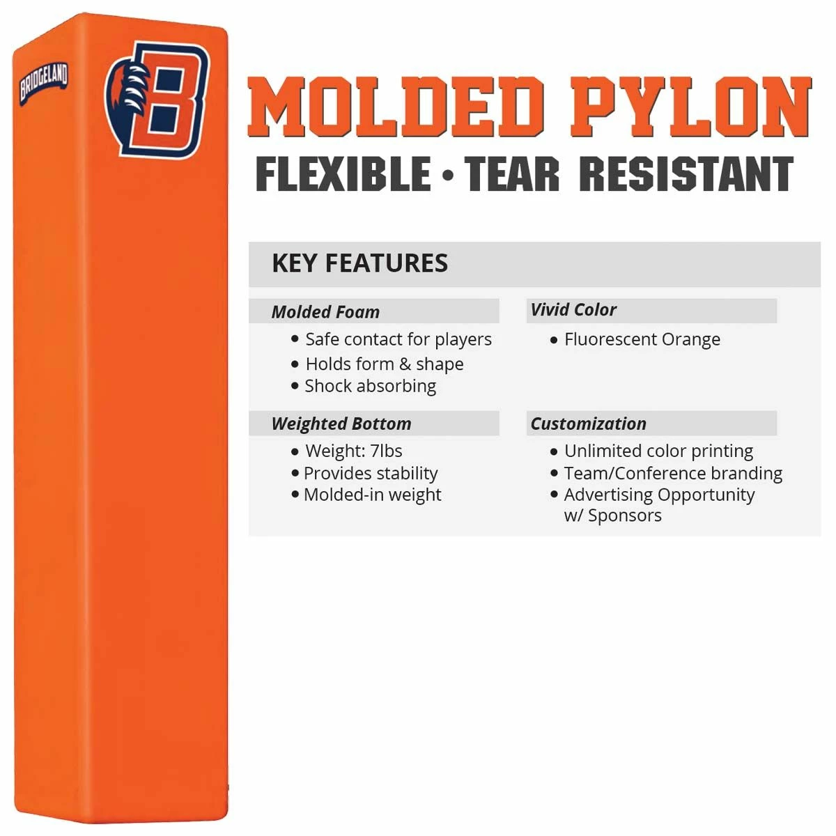 The molded end zone pylons from Fisher are flexible and tear resistant, holding up to the toughest hits during a game. Enhance the look of your end zone by adding your team or conference logo to the pylons, included at no extra charge. There are unlimited color options available for your custom design. Just email us your artwork to get the ball rolling. These fluorescent orange pylons are offered in sets of 4, 8, or 12 and are constructed with molded foam that holds its shape while being extra shock absorbing and safe when players make contact. The weighted bottoms provide stability so you donβt have to worry about them falling over on their own.