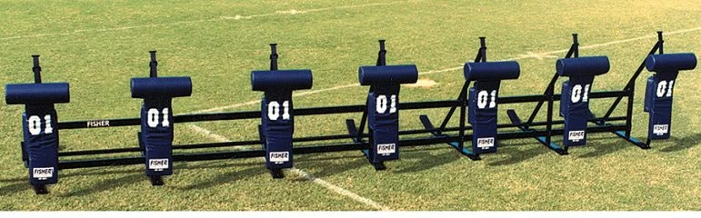 This Fisher CL JV 7 man sled is ideal for middle school through high school programs because of its TITE-LOCK modularΒ chassis that provides the rigidity needed in a multi-unit sled. Β Player safety is improved due to the wraparound design of the T Pads.The main frame is tough, durable and guaranteed to last for 5 years. Β The all metal surfaces are powder coated to prevent rust and the leaf spring design virtually eliminates all spring cracking and breaking. Β The 30 degree angle on the skids assures you of a smooth transition over your field without chewing up your turf or grass. Β The high density, 100lb impact resistant foam is covered with durable 18oz vinyl covers that are then double and triple stitched to withstand harsh weather and years of hard use.