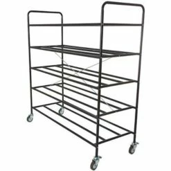 This large capacity helmet rack holds up to 60 helmets and fits through standard doorway on heavy duty swivel casters.