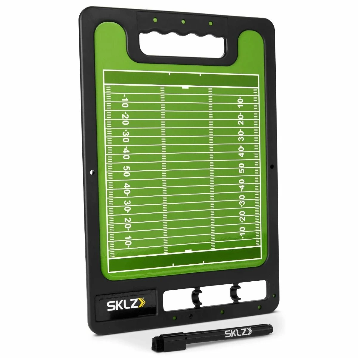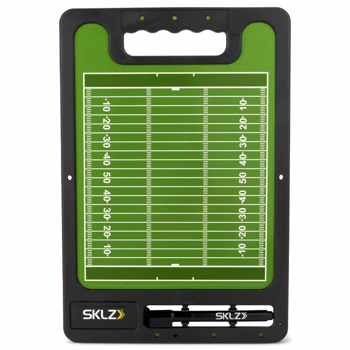 Draw up plays for both offense and defense with the SKLZ football coaches board. This 9″ x 13″, two-sided dry erase coaching board features a full 100-yard field on one side and a 50-yard half field on the backside for different field tactics. The board is equipped with a blank section on the 50-yard side for coaches to give in game adjustments and plays quickly and efficiently. This football coach’s board includes a dry-erase marker with a built-in dry erase marker holder and a convenient handle for carrying on the sideline. Perfect for traveling to games and practice, the SKLZ football coaches board fits in just about any bag.