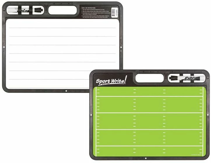 Sport Write Pro FootballΒ Coaching Board comes in a new smaller size, but keep the same specs as the Classic boards (see A94-373). The whole team can see you set plays with this large dry erase board. This 16.5″ x 12.5″ board is lightweight and durable with two dry erase writing surfaces. One side is a field diagram; the other is aΒ notes area. Includes pen clip, dry erase marker and handle for carrying.
