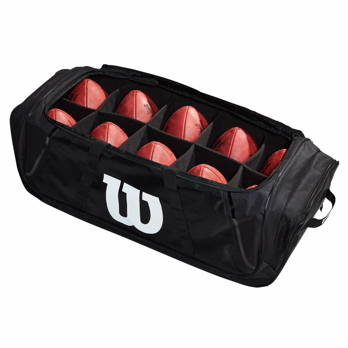 Wilson’s 10-ball football duffle bag keeps footballs warm and dry in all weather conditions.ย The bag has removable EVA dividers and a water resistant bottom. Protect your game balls from scuffing in the fleece lined ball compartments. The bag has a durable 600 denier polyester construction that is rugged enough to last season after season.